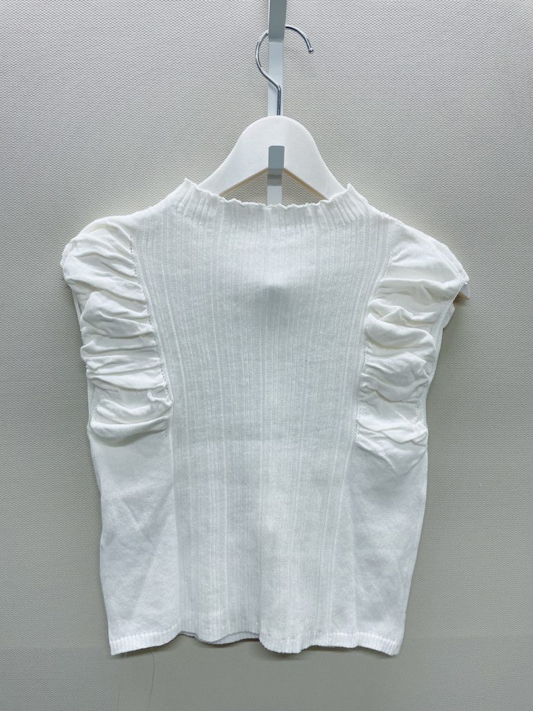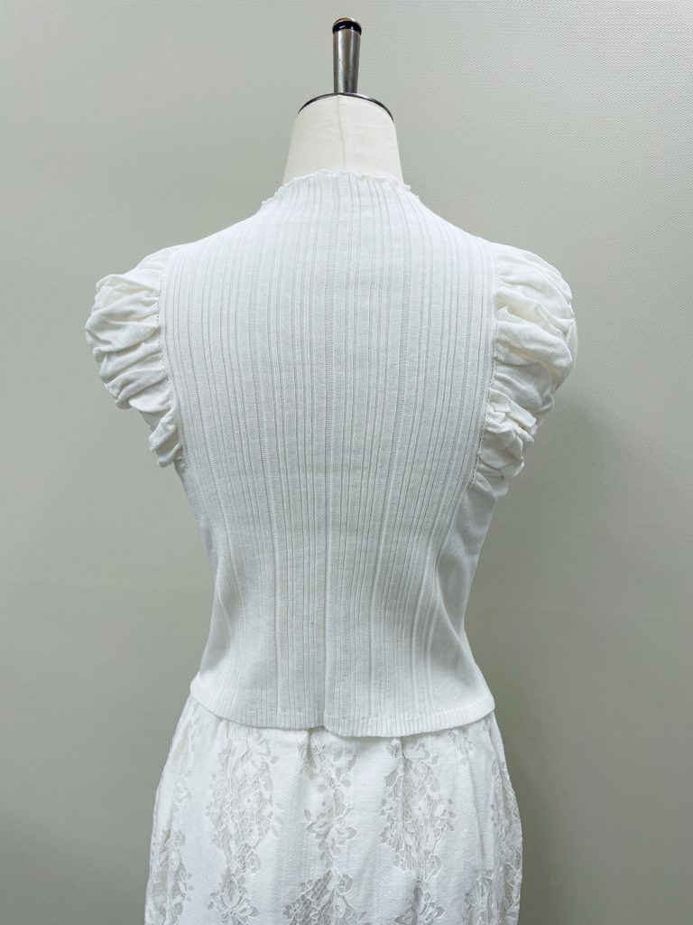 ハイネックぎみの襟元とノースリーブ風の袖まわりが、どこかクラシックな印象を演出。